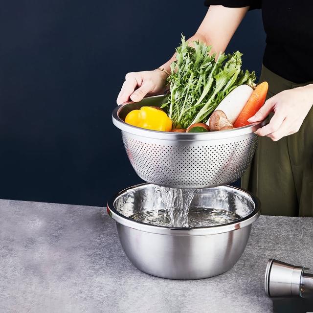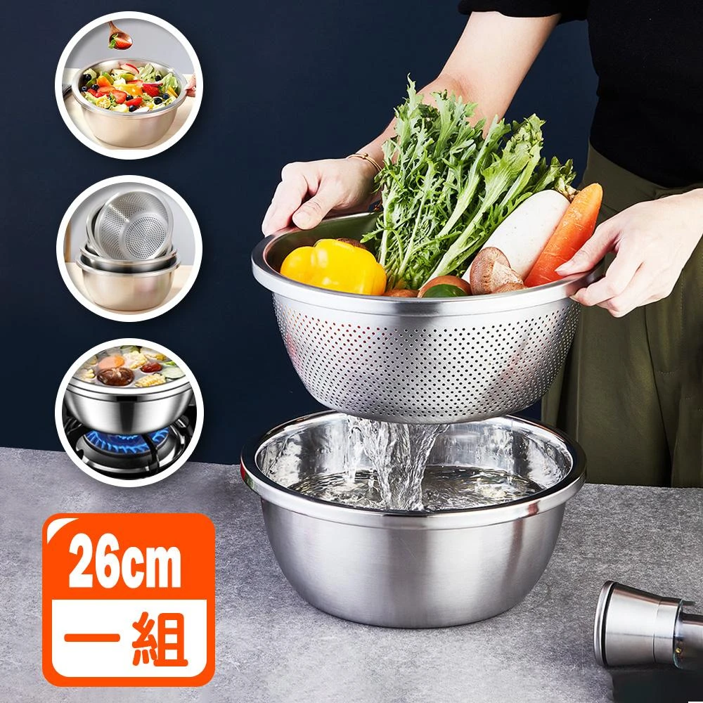 304不鏽鋼多功用加厚洗菜瀝水盆-26cm瀝盆組/304不鏽鋼/多功能瀝水盆/調料盆/洗菜/水果籃(清SALE)