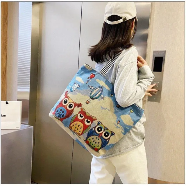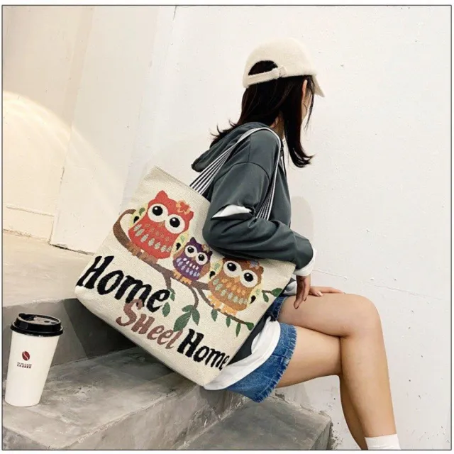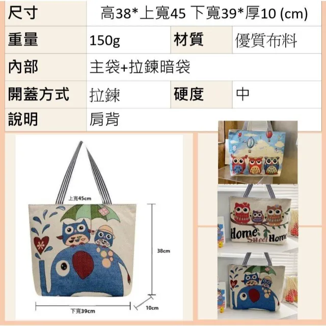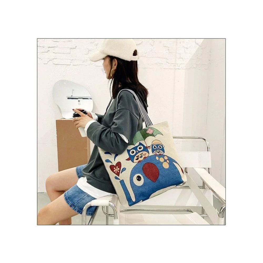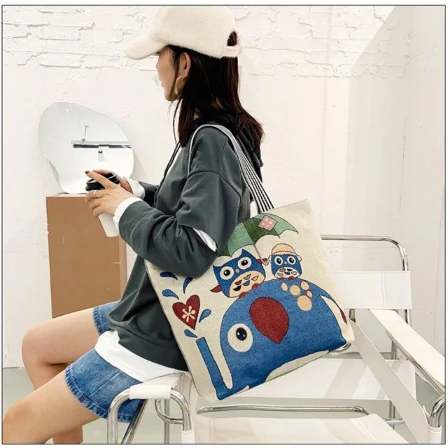 大容量時尚帆布托特包 時尚卡通刺繡單肩女包 學生手提托特包 大容量帆布袋 送禮