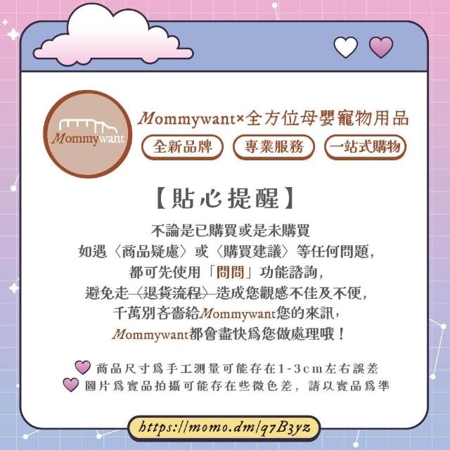 - 不論是已購買或是未購買如遇 商品疑慮 或 購買建議 等任何問題,都可先使用「問問」功能諮詢,避免退貨流程或觀感不佳等問題造成您的不便,千萬別吝嗇給Mommywant您的來訊,Mommywant都會盡快為您做處理哦!