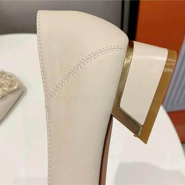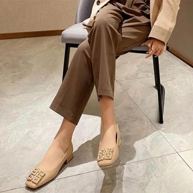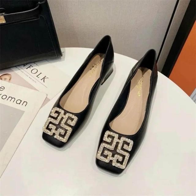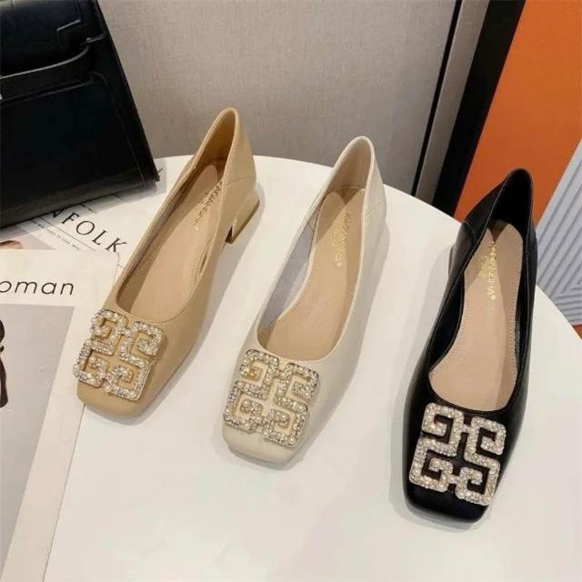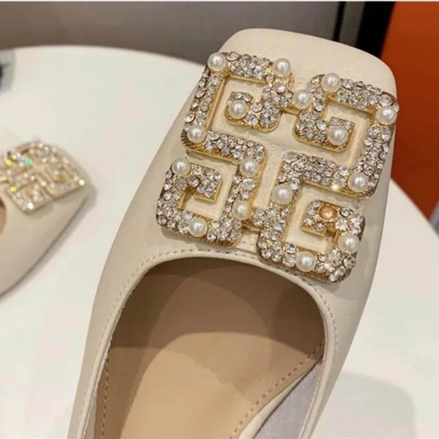 K&J 閃亮服飾 熱銷款 氣質百搭水鑽方釦真皮低跟鞋 低跟鞋 平價女鞋 婚禮鞋