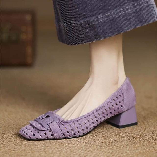K&J 閃亮服飾 法式小羊皮鏤空透氣柔軟粗跟鞋 鏤空透氣 柔軟粗跟鞋 真皮高跟鞋 夏日涼鞋 女生粗跟鞋 舒適高跟鞋