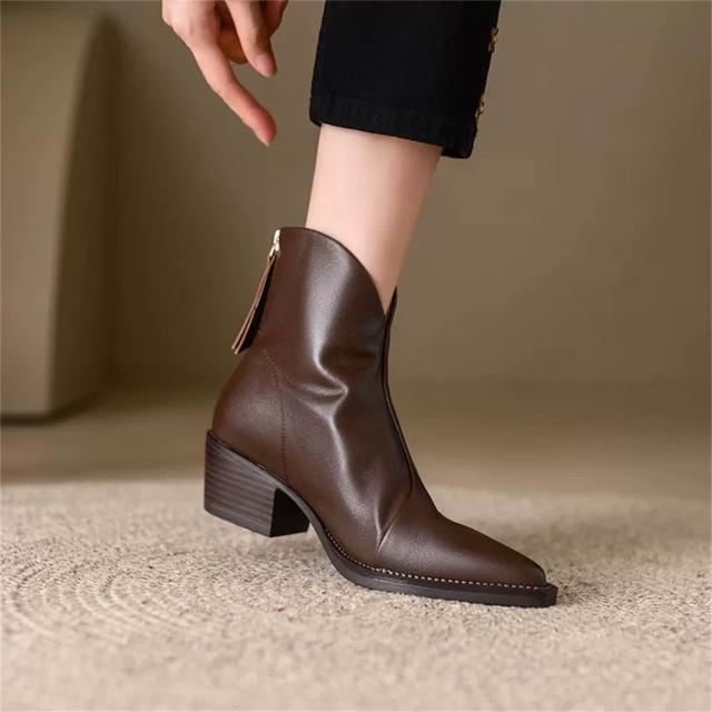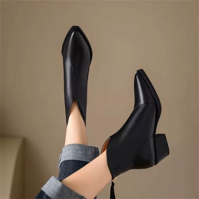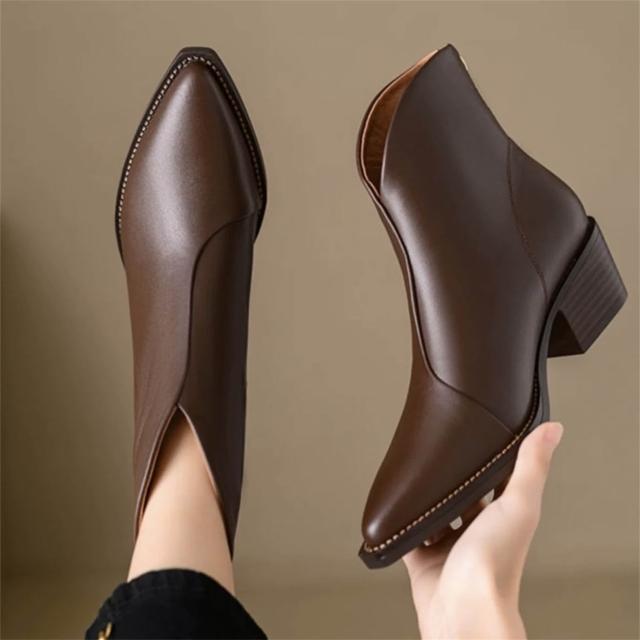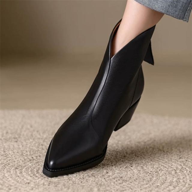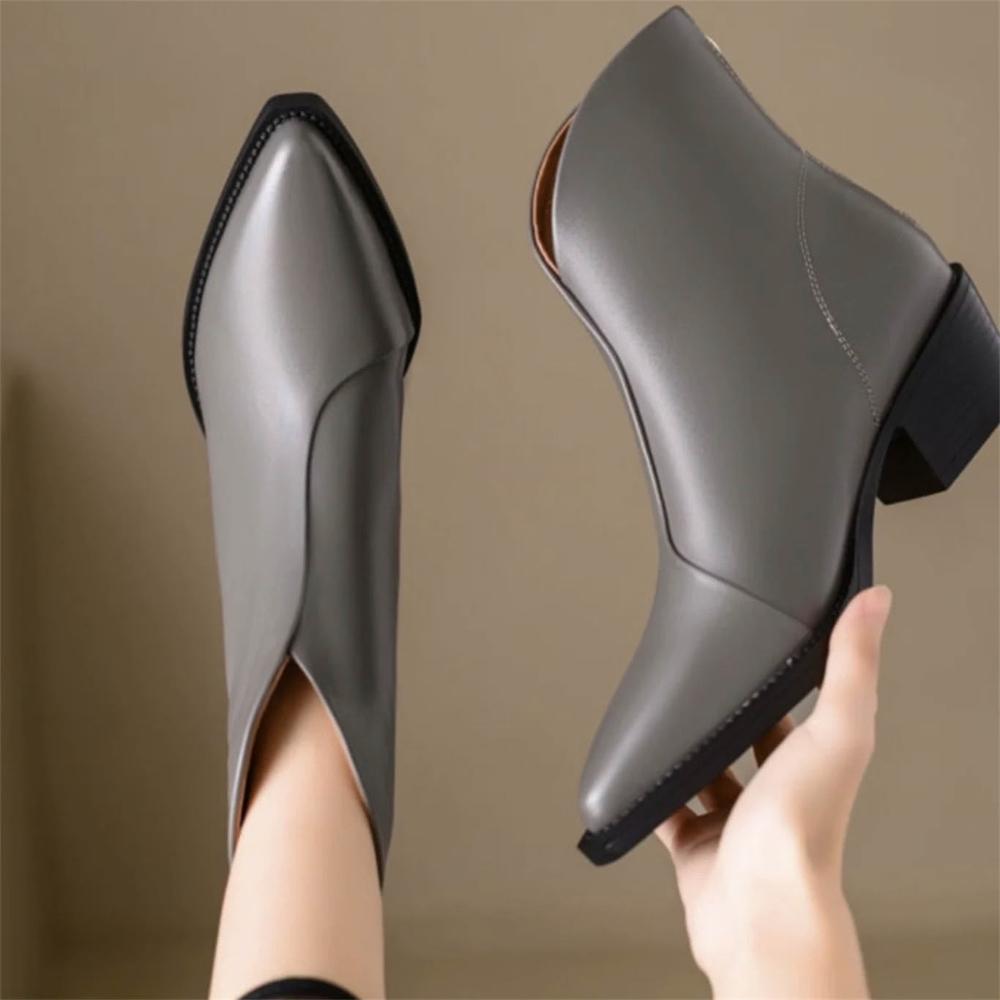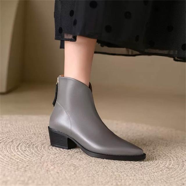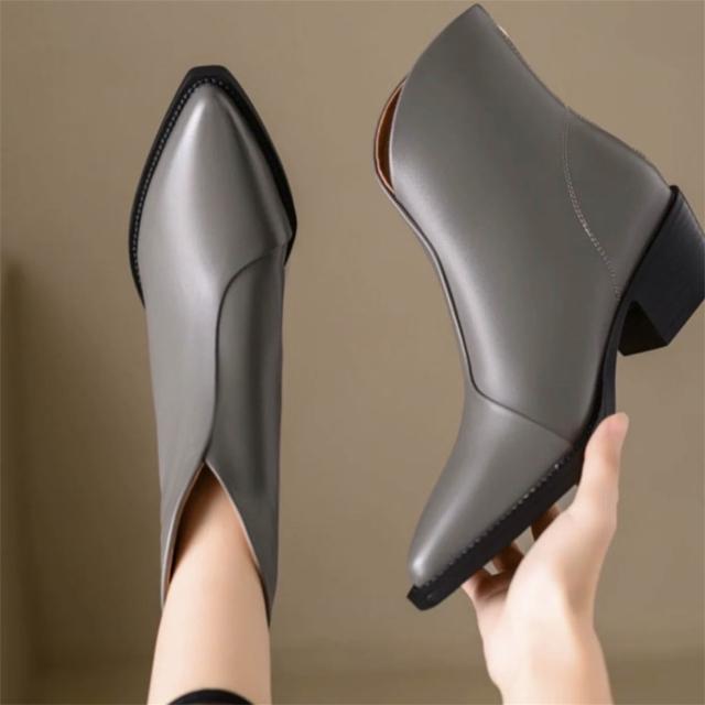 K&J 閃亮服飾 法式灰色真皮V口尖頭短靴|粗跟中跟後拉鍊設計 顯瘦短靴 法式風短靴 高級感靴子 穿脫方便靴 後拉鍊短靴