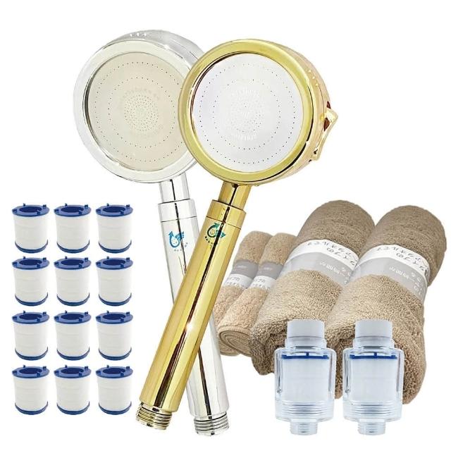 金牌川之舞WH388三段增壓蓮蓬頭2支+PP除氯過濾器2個+雪尼爾大浴巾2條+毛巾2條+濾芯12顆 水呼呼冬浴套裝超值組