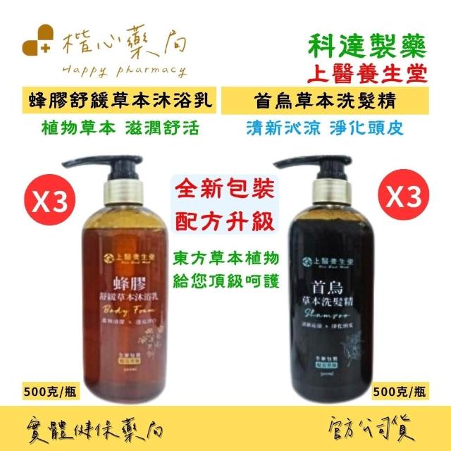 楷心藥局 科達|上醫養生堂 首烏草本洗髮精(500g/罐) X3+ 蜂膠舒緩草本沐浴乳(500g/罐)X3 草本 溫和