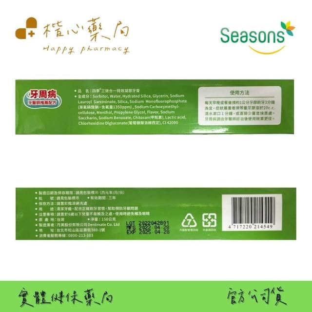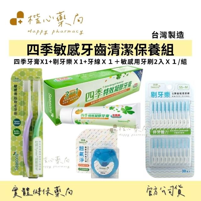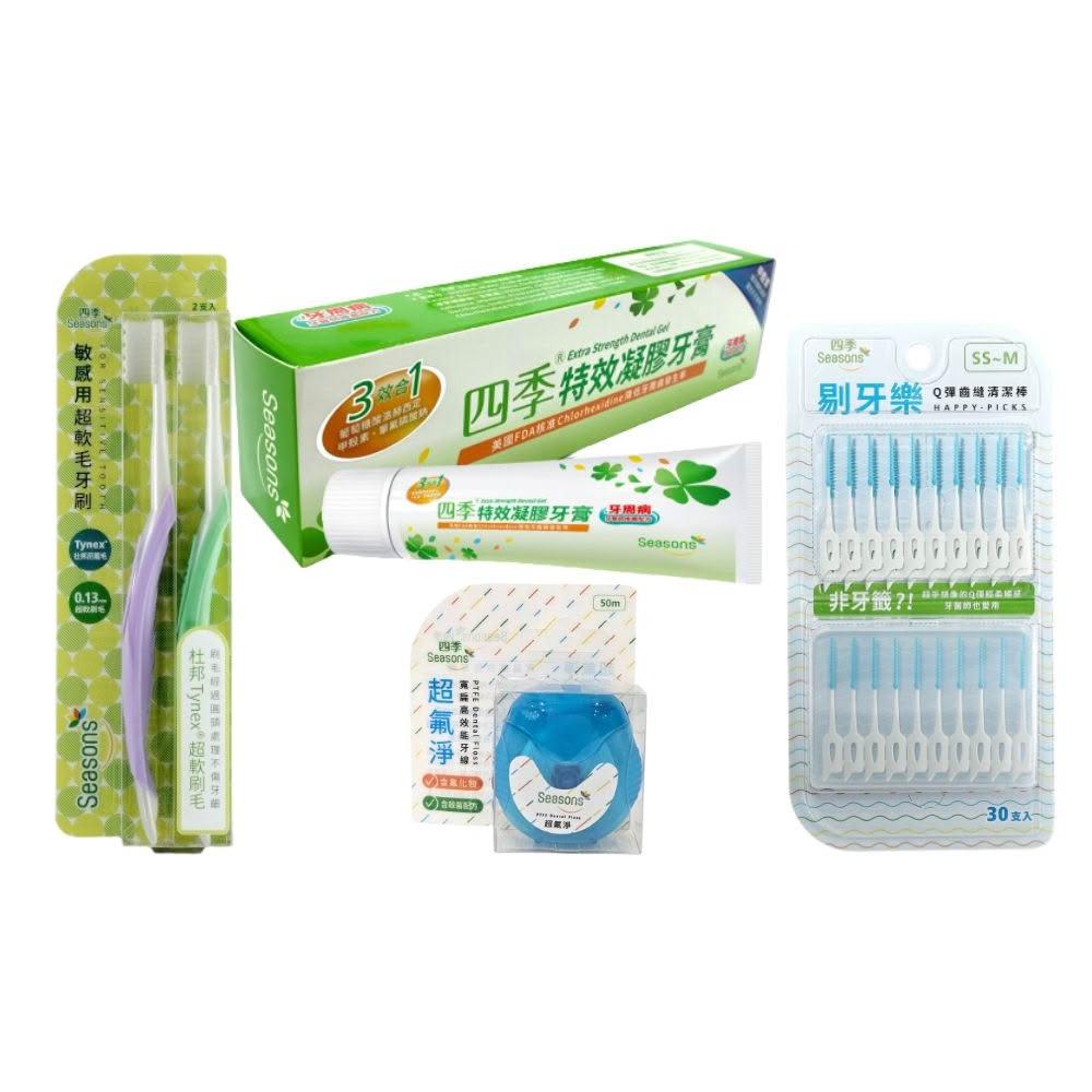 楷心藥局 四季 Seasons 3效合1特效凝膠牙膏X1+剔牙樂-Q彈齒縫清潔棒+超氟淨寬扁高效能牙線50M/個+四季敏感用超軟毛牙刷2入/組
