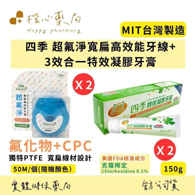 楷心藥局 四季SEASONS 3效合1特效凝膠牙膏X2+超氟淨寬扁高效能牙線50M/個X2(隨機顏色)含 氟化物 氟 牙線