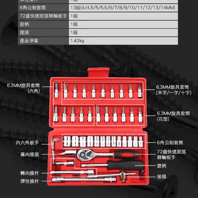 套筒工具組 汽修工具組46件 棘輪板手 鉻釩鋼套筒組 螺絲刀套筒組 維修工具套裝 套筒組合 085-CRV46