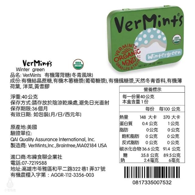 美國 Organic VerMints 有機薄荷糖40g-任選 (清口糖/無麩質/素食/低卡零食/糖果)