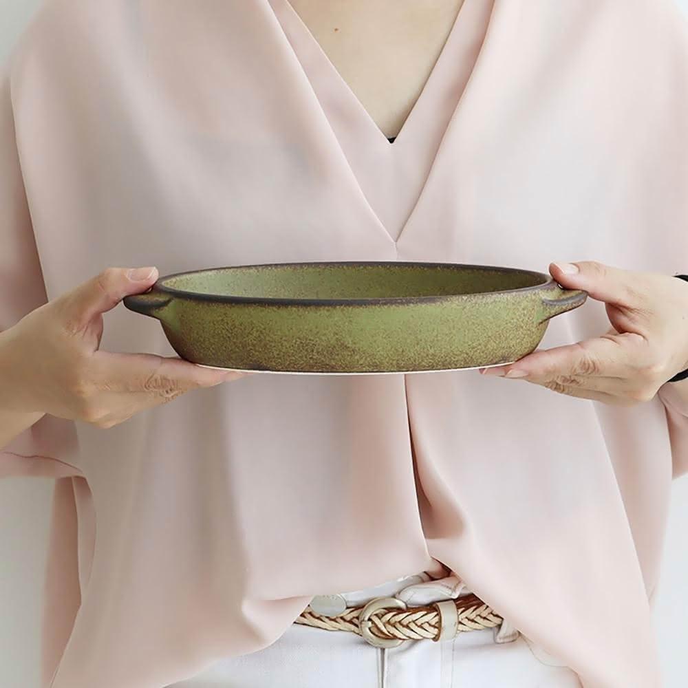 美濃燒昭和製陶 橢圓雙耳焗烤盤 23.5cm (艾草綠;陶瓷烤盤/燉飯碗/千層麵烤盤/日式餐具)