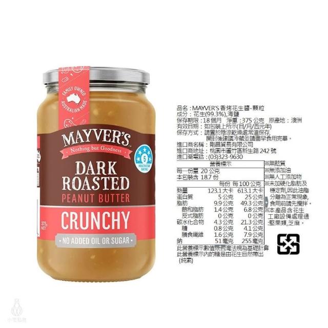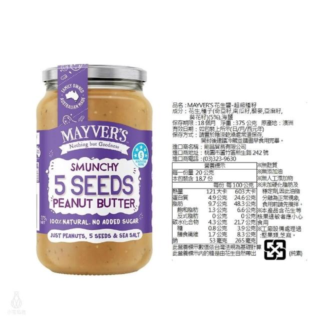 澳洲 Mayvers 香烤無糖花生醬375g (顆粒/絲滑/無鹽/超級種籽;純素/PEANUT/無麩質)