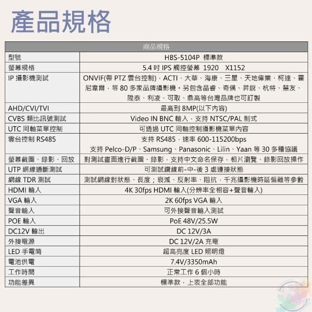 5.4吋五合一網路綜合型測試工程寶 5104P(5100P)(800萬/4K/監視器測試工程寶/工程測試器)