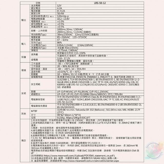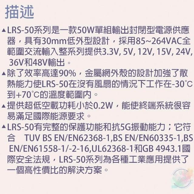 MEAN WELL明緯 50W單組輸出電源供應器12V/4.2A LRS-50-12
