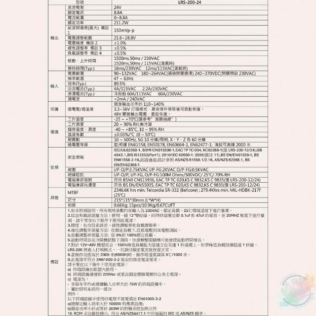 MEAN WELL明緯 200W單組輸出電源供應器24V/8.8A LRS-200-24