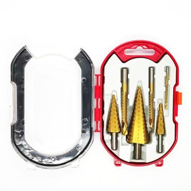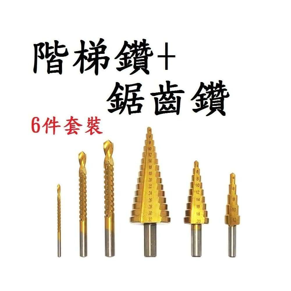 階梯鑽+鋸齒鑽頭6支裝 寶塔鑽 木工 拉槽鋸鑽組 套三角柄 鑽頭 高速鋼 4241 鍍鈦階梯鑽 套裝塔克網購