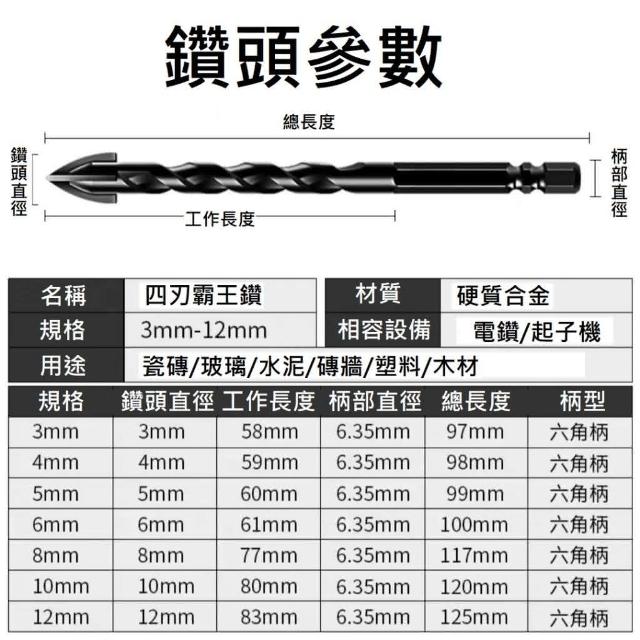 四刃霸王鑽頭-單支 鎢鋼 三用鑽 陶瓷鑽孔 玻璃鑽孔 加長陶瓷磚 水泥牆壁體開孔 三角鑽頭