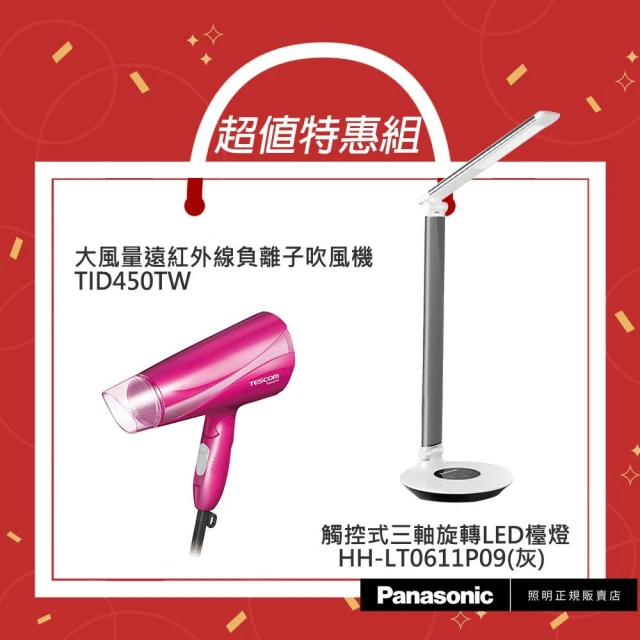 Panasonic 國際牌超值組合優惠 國際牌Panasonic 觸控式三軸旋轉LED檯燈 HH-LT0611P09灰+ 日本TESCOM 大風量遠紅外線負離子吹風機 TID450TW