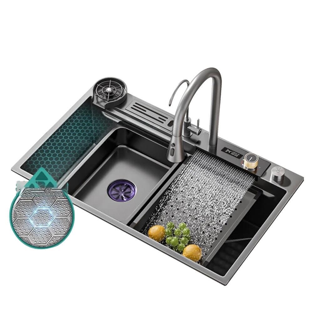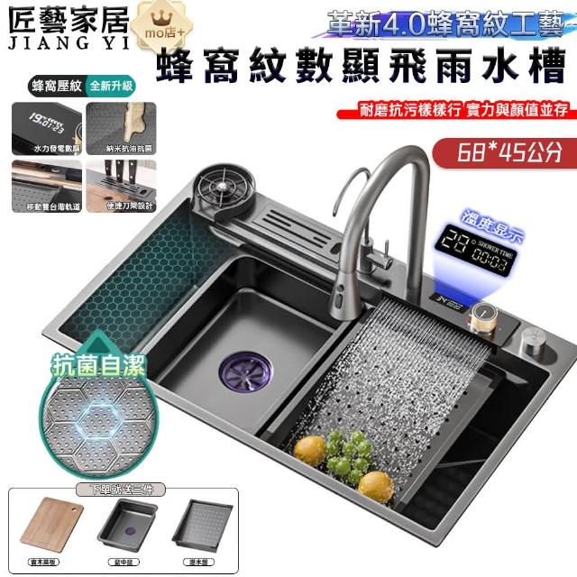 匠藝家居數顯蜂窩壓紋飛雨大單槽 厨房水槽(68*45F套裝 納米抗菌 溫度數顯 耐刮蜂窩紋)