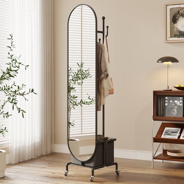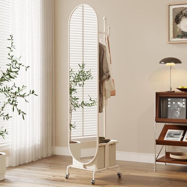 匠藝家居奶油風可移動穿衣鏡 掛衣架 收納架 輕奢旋轉全身鏡 落地衣帽架 多功能移動衣帽鏡 收納籃 高清無色差