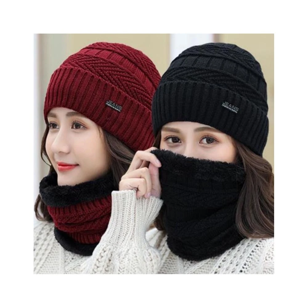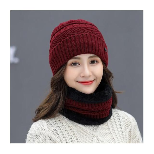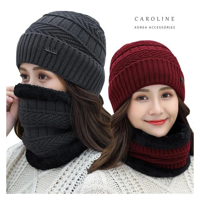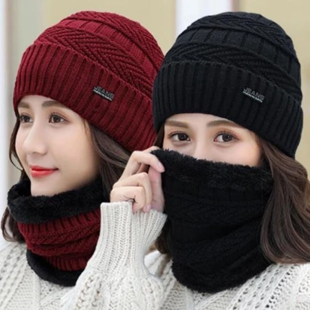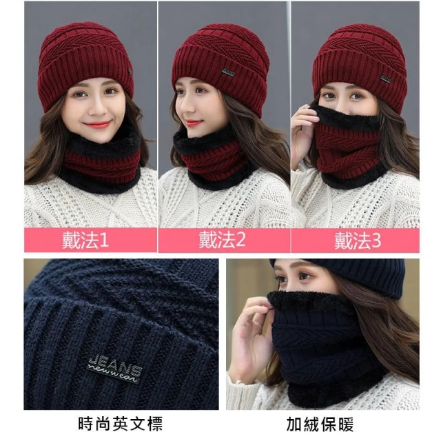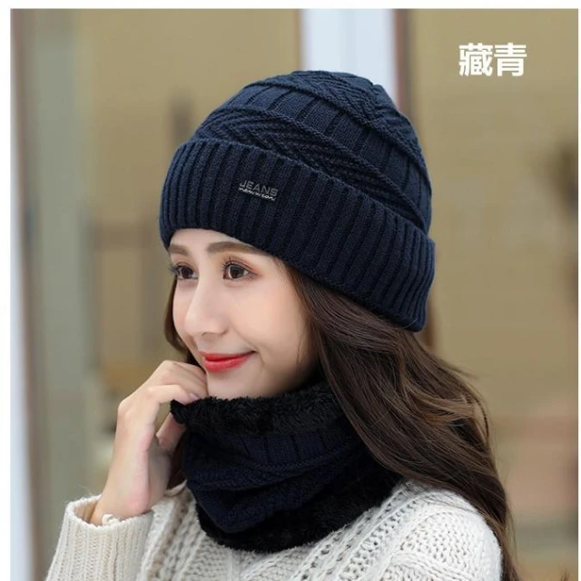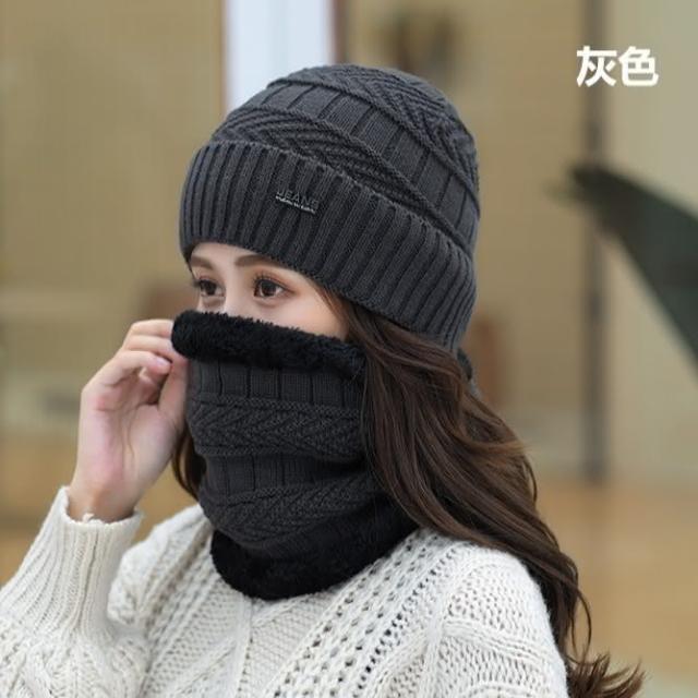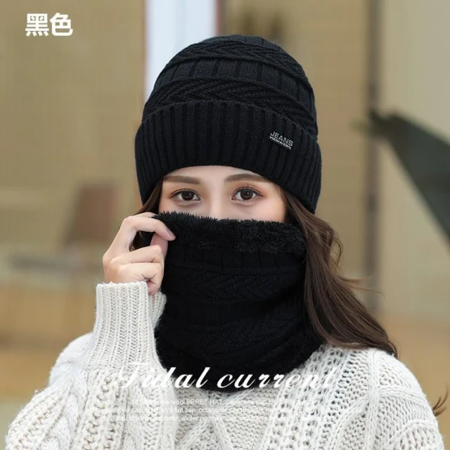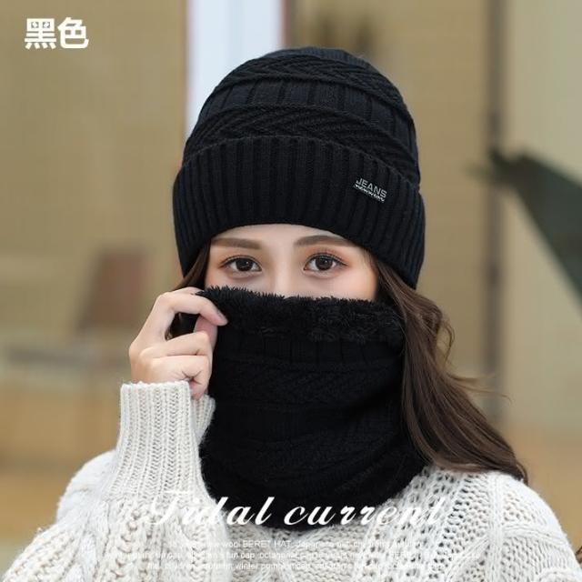 韓版秋冬套頭帽貼布加绒保暖針織毛線帽&圍脖2件套組72382(針織毛線帽&圍脖2件套組)