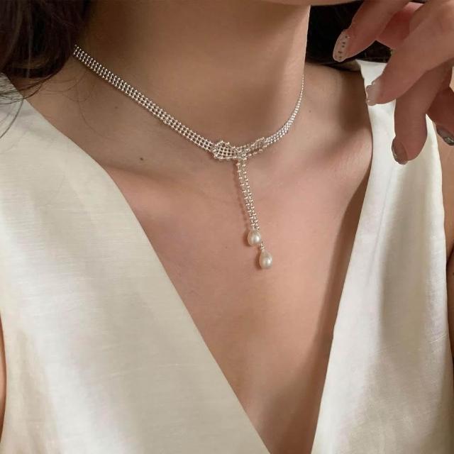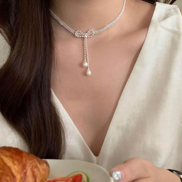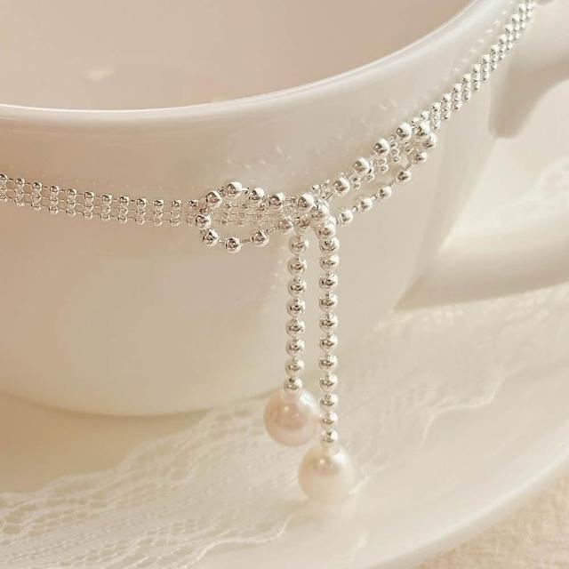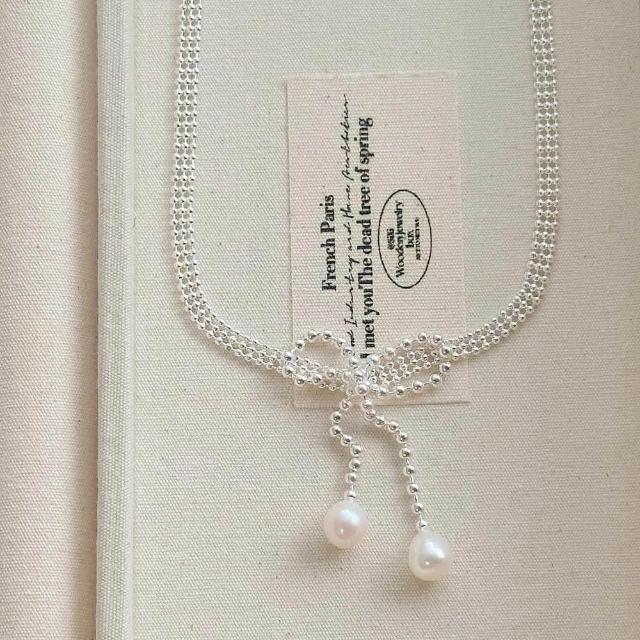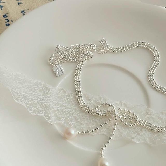 Rencontre 韓國 浪漫芭蕾風 蝴蝶結排珠 淡水珍珠 純銀項鍊