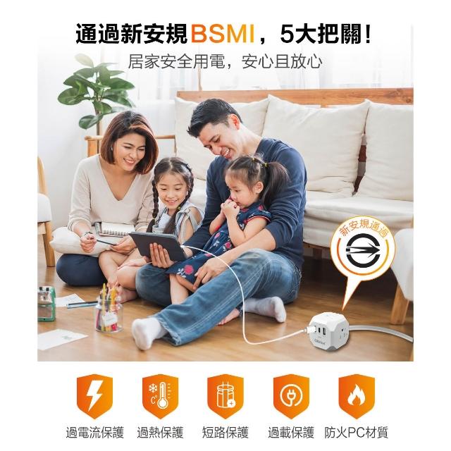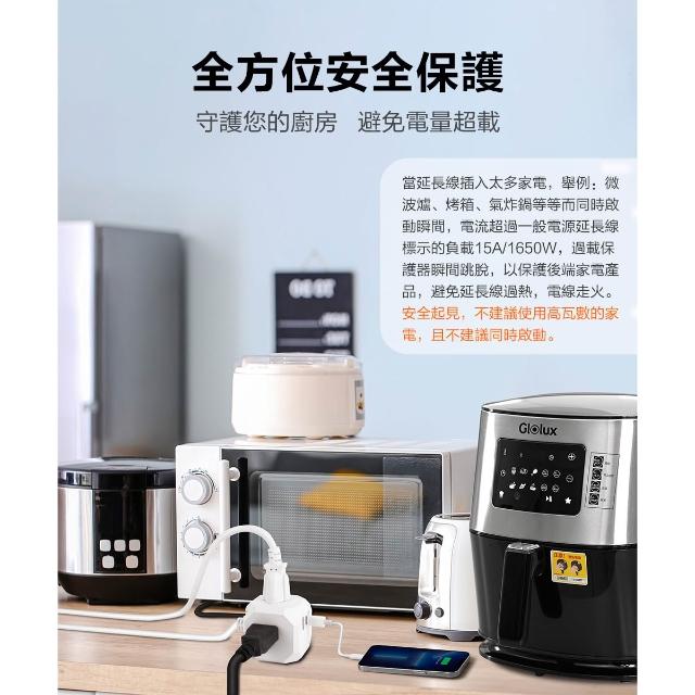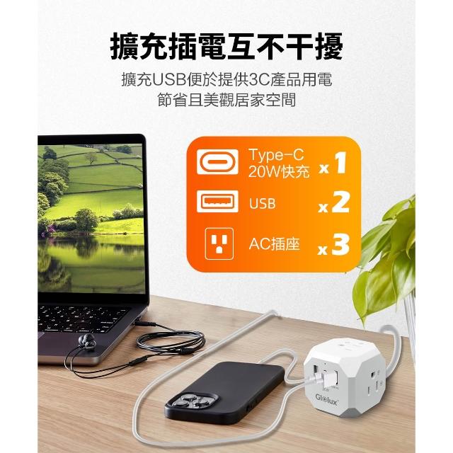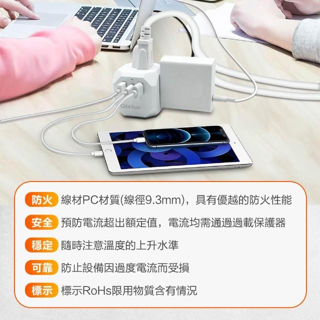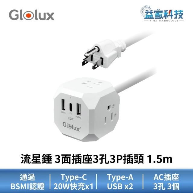 Glolux流星錘 3面插座延長線1.5M (3孔3P插頭x3/USB-A x2/Type-C快充x1)