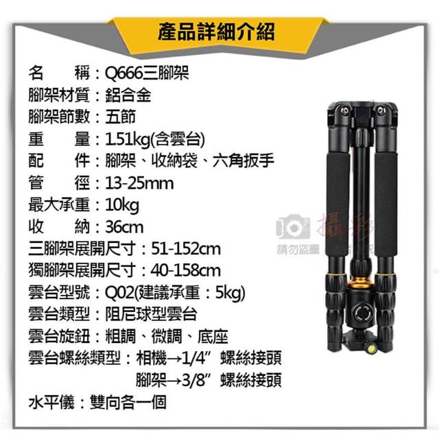 攝彩Q666三腳架(超輕量 單眼相機獨腳架 鋁合金 旋鈕式鎖腳 Q02球型雲台 反折收納36cm)