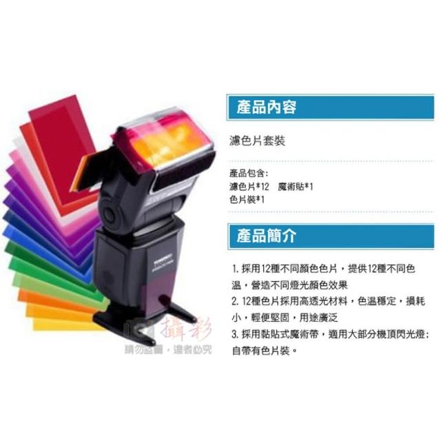 攝彩超值12色閃燈濾色片(通用型閃光燈矯色片 快速組裝快速換色 不同色溫燈光效果濾色片 攝影小道具)