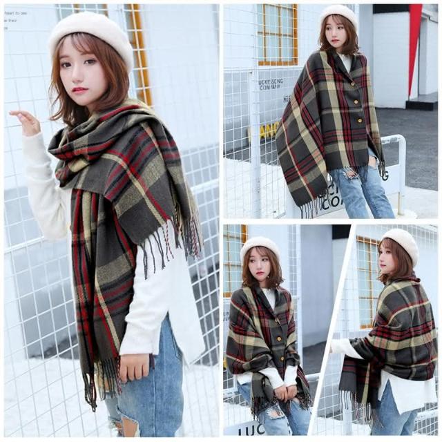 多用保暖圍巾外套 仿羊絨鈕扣斗篷披肩流蘇格子圍巾 /JM Shop圍巾外套