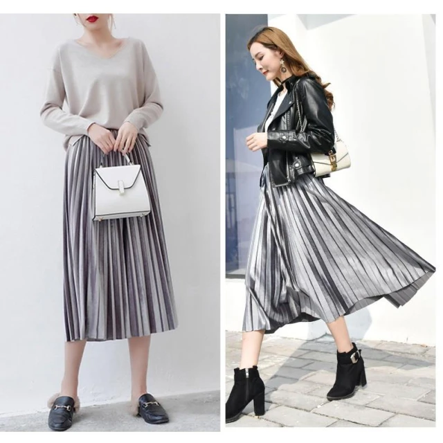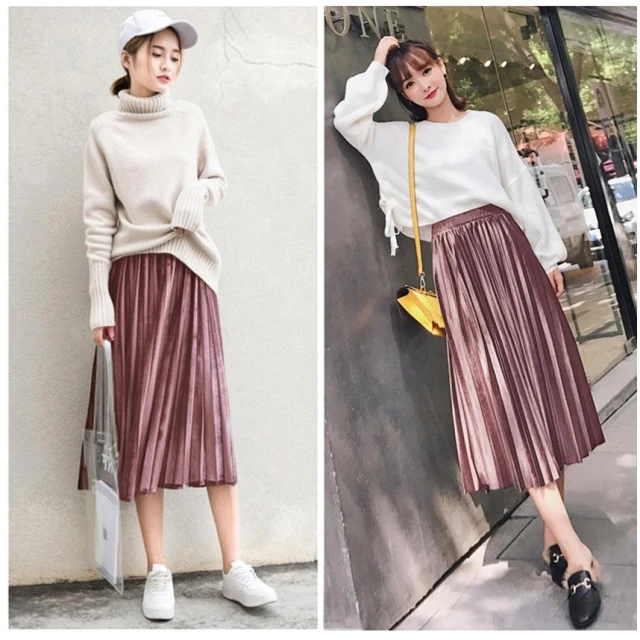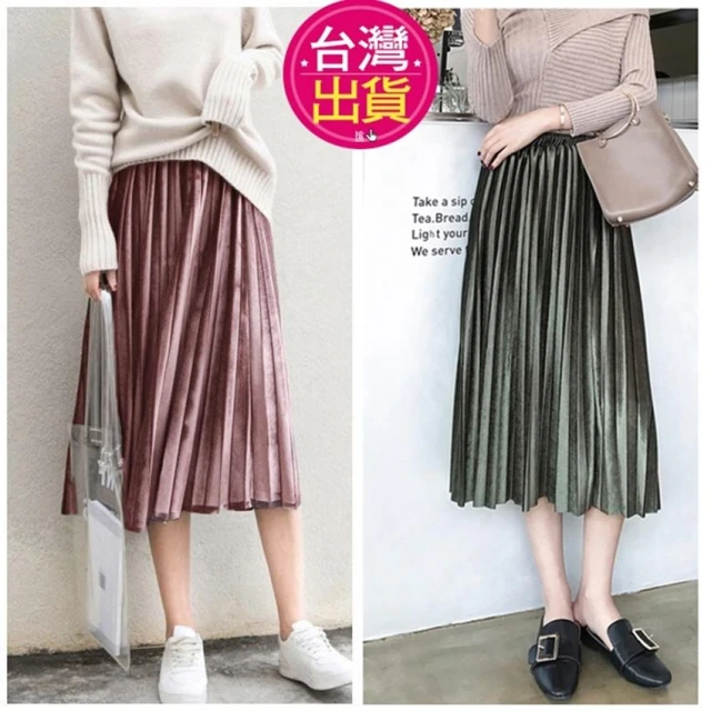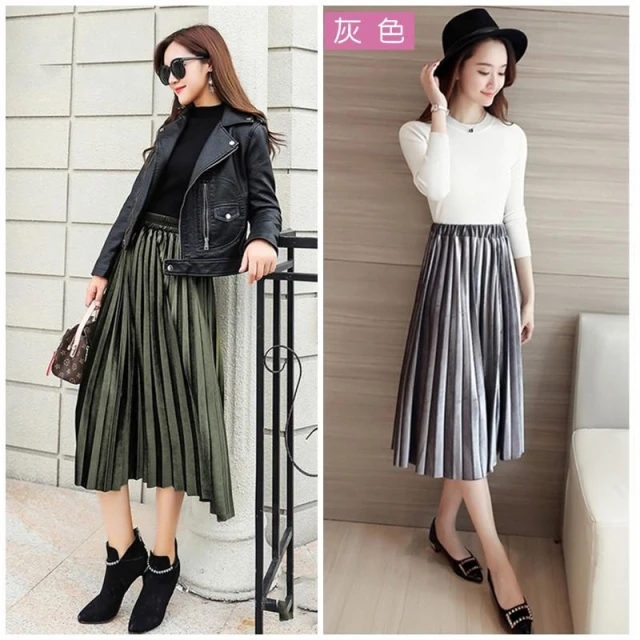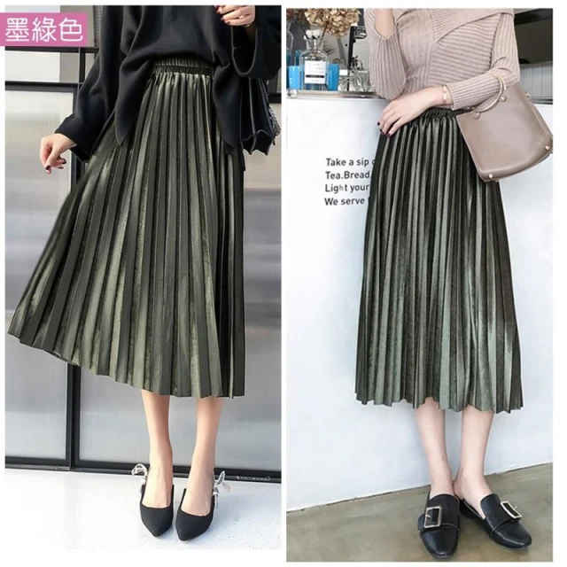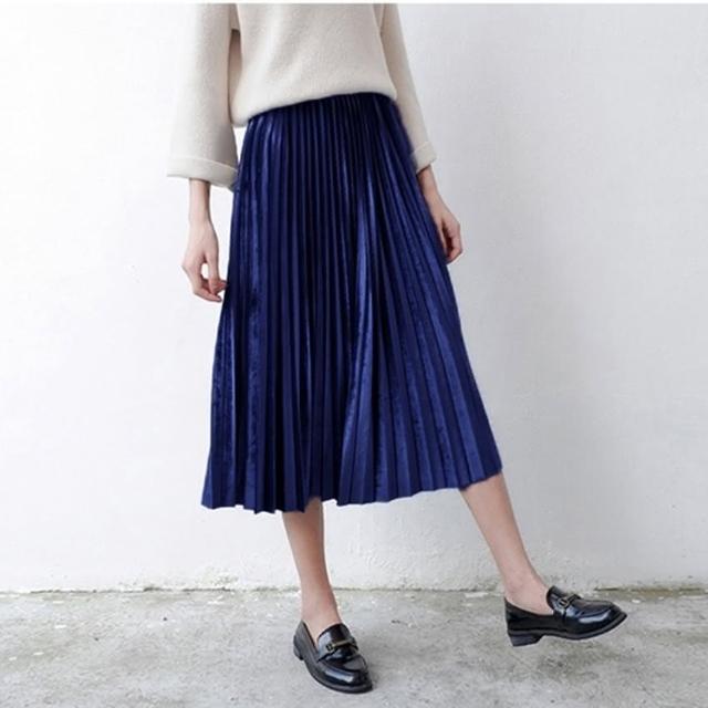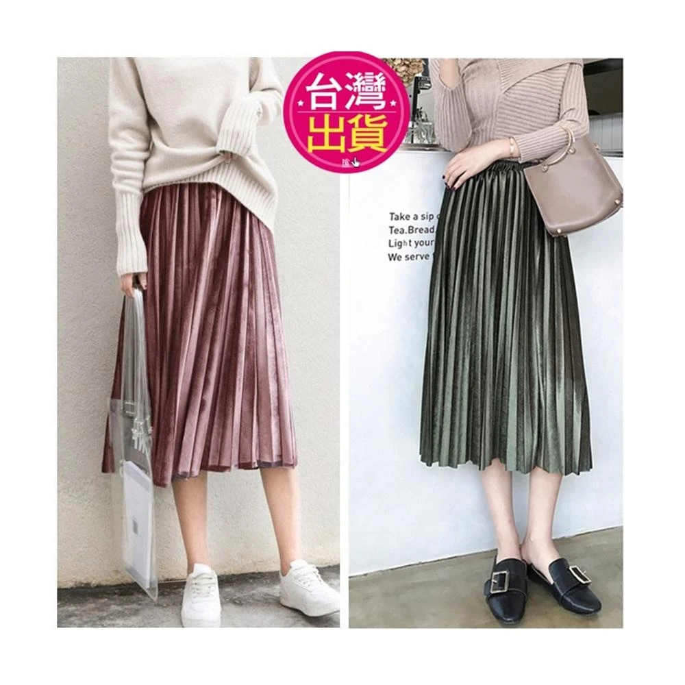 韓風金絲絨光澤亮面百褶長裙 百搭純色半身裙 學院風過膝裙 金絲裙 /JM Shop長裙
