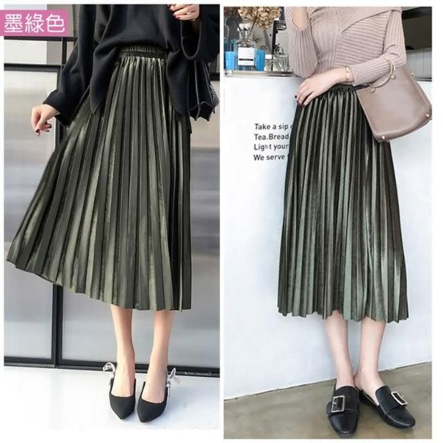 韓風金絲絨光澤亮面百褶長裙 百搭純色半身裙 學院風過膝裙 金絲裙 /JM Shop長裙
