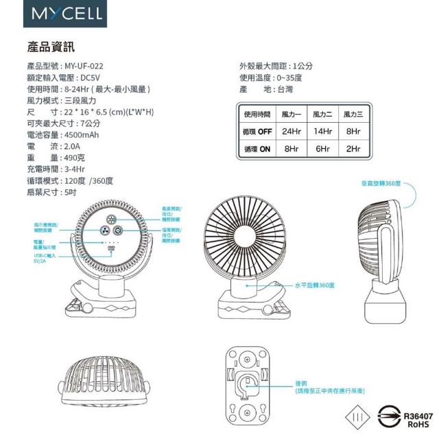 山水之寶MYCELL 4500mAh 360°旋轉USB充電小風扇 第二代 內附遙控器 可上飛機 台灣製造 原廠公司貨
