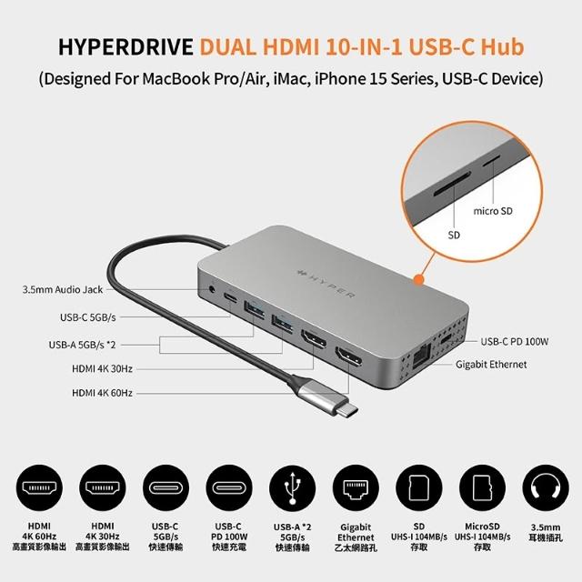 HyperDrive 10-in-1 HDMI 雙螢幕 轉接器 USB-C Hub 4K 影像 集線器 HPD005
