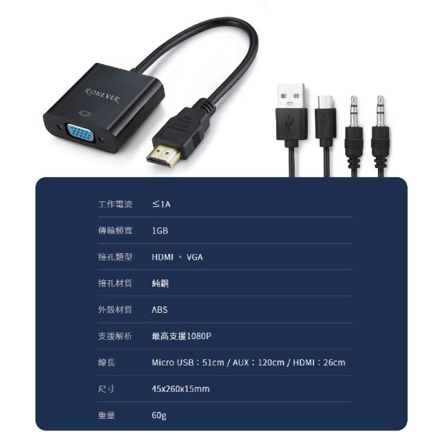 RONEVER 高清多媒體介面to VGA轉接器 HDMI 轉換線 轉接頭 3.5mm micro USB RV010