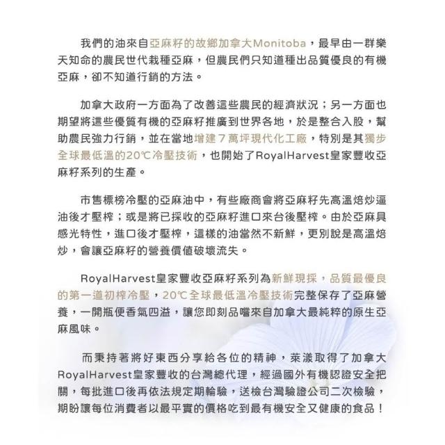 ❰ 皇家豐收❱有機亞麻籽油 冷壓初榨《短效到2026.1.15+售完停產+公司貨》亞麻油 亞麻仁油 萊漾 Omega