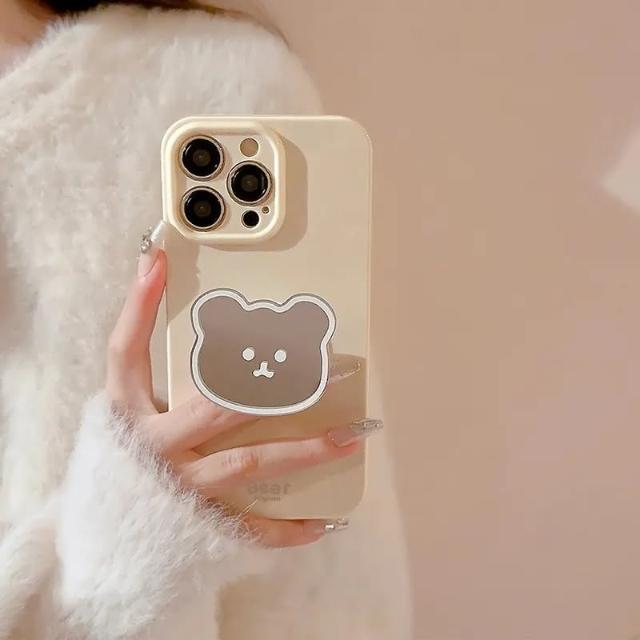 Twinko超可愛奶油色系手機殼+熊熊鏡子支架2件組/iPhone15 14 13 12 ProMax-CA1684(手機殼/保護殼)
