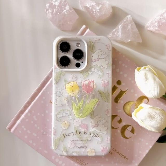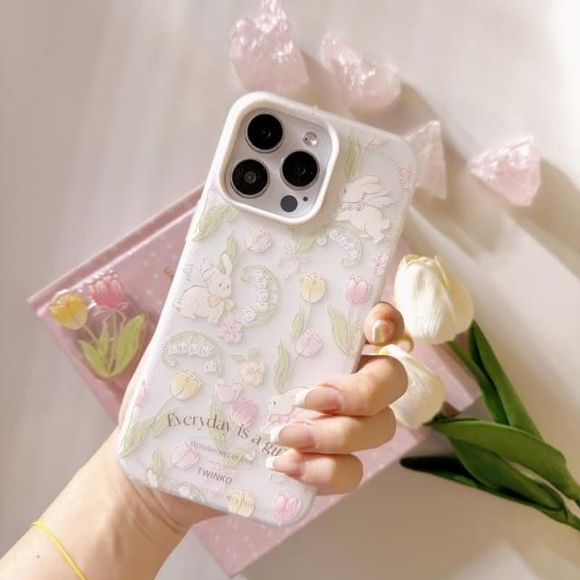 Twinko獨家設計 法式花園鬱金香兔兔*不客製化-雙層2合1透白防摔殼/iPhone15 14 13-CA1852(手機殼/鬱金香兔兔/二合一保護殼)