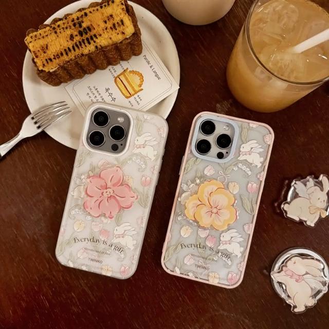 Twinko獨家設計 法式花園鬱金香兔兔*不客製化-雙層2合1透白防摔殼/iPhone15 14 13-CA1852(手機殼/鬱金香兔兔/二合一保護殼)
