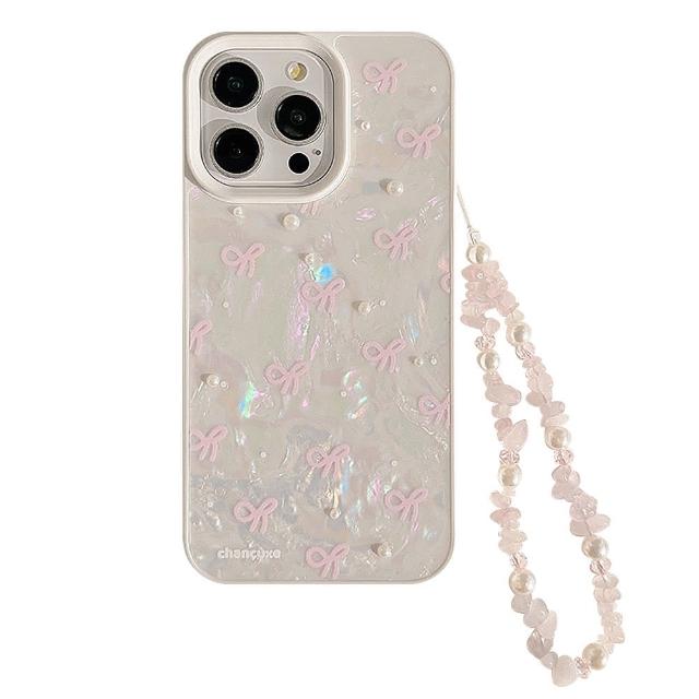 Twinko粉色蝴蝶結珍珠貝殼*殼+珍珠貼紙+珍珠粉水晶腕鍊-三件組/氣質貝殼紋手機殼/iPhone16 15 14 13-CA1871(手機殼/貝殼紋/蝴蝶結/保護殼)