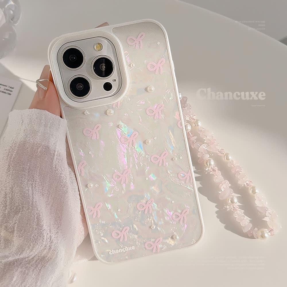 Twinko粉色蝴蝶結珍珠貝殼*殼+珍珠貼紙+珍珠粉水晶腕鍊-三件組/氣質貝殼紋手機殼/iPhone16 15 14 13-CA1871(手機殼/貝殼紋/蝴蝶結/保護殼)