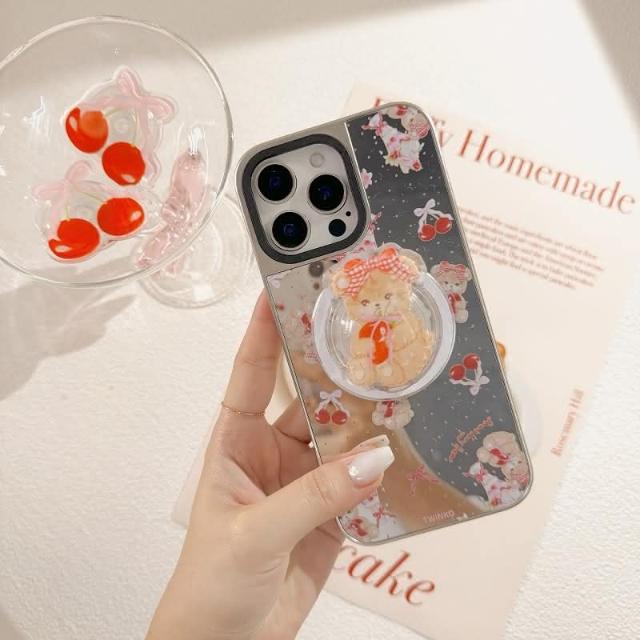 Twinko甜美櫻桃Jennie小熊不客製賣場/高質感霧面銀邊鏡面殼/磁吸殼/IPHONE16 15 14PRO-CA1914(手機殼/保護殼/防摔殼)