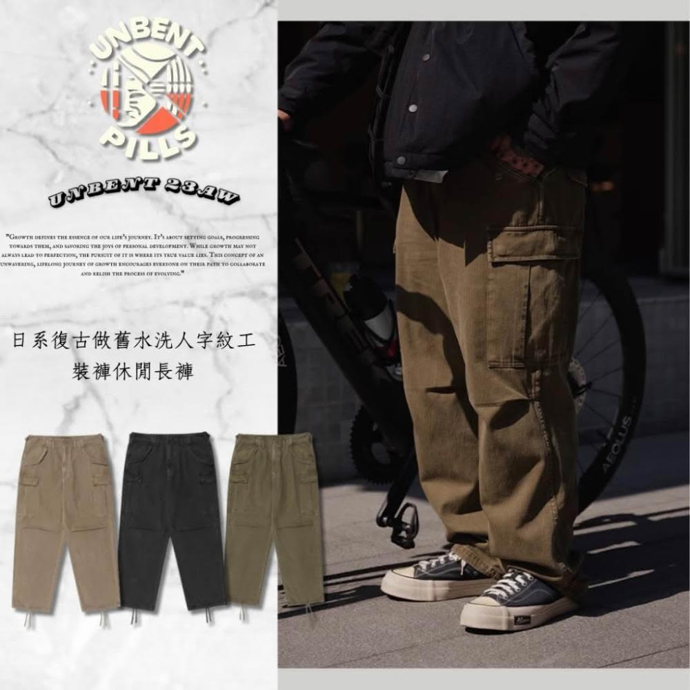 『Pills Select』UNBENT-23071 現貨 日系 復古 做舊 水洗 人字紋 工裝褲 休閒長褲