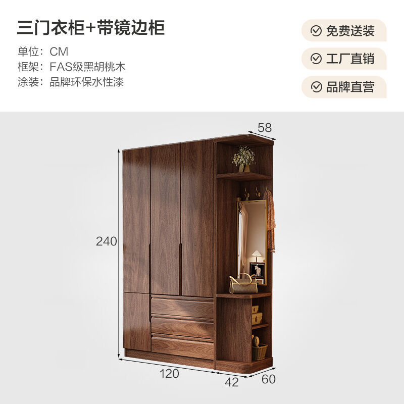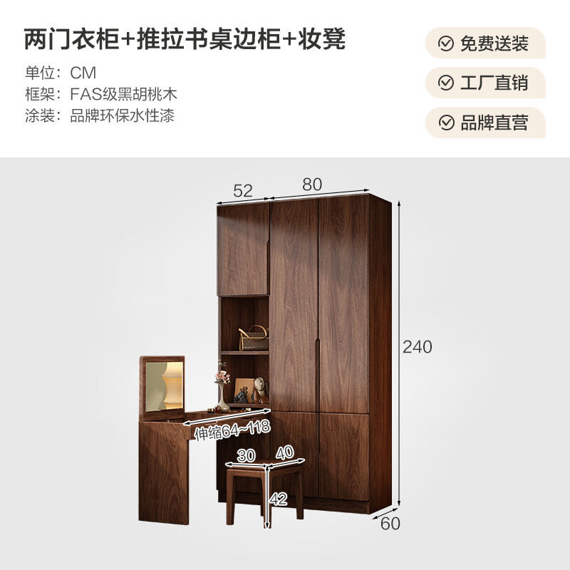 黑胡桃木實木衣櫃轉角化妝桌組合小戶型臥室家用書桌櫃一體學習桌