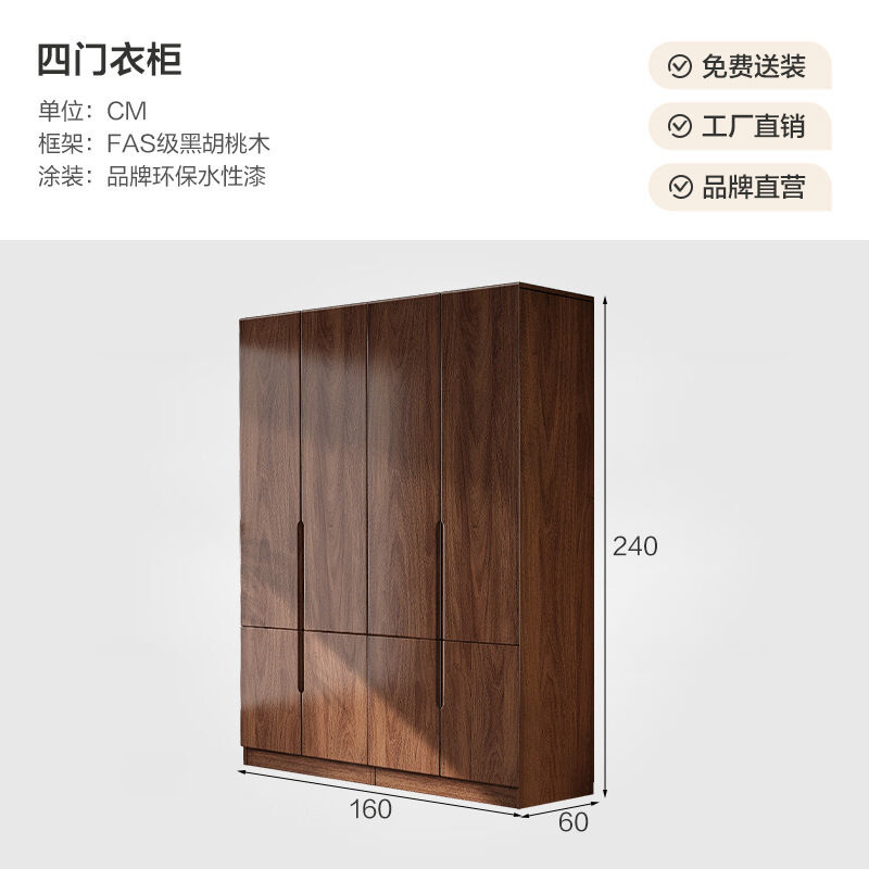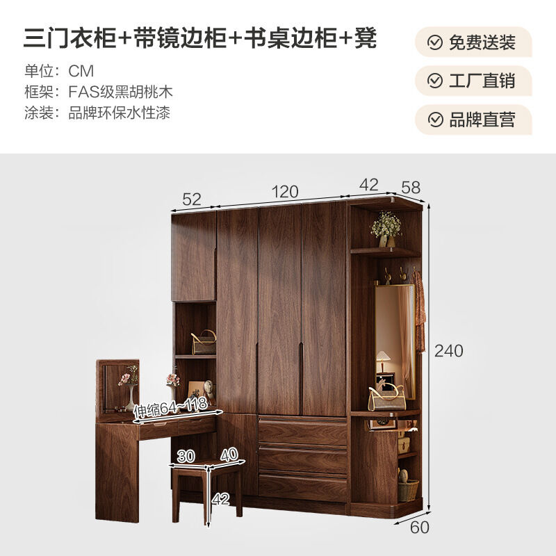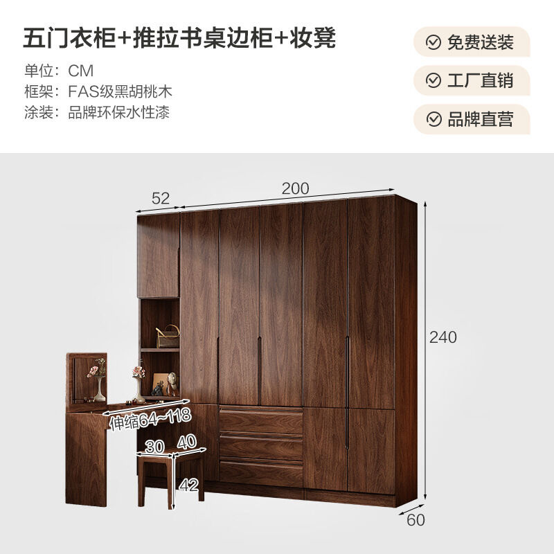 黑胡桃木實木衣櫃轉角化妝桌組合小戶型臥室家用書桌櫃一體學習桌