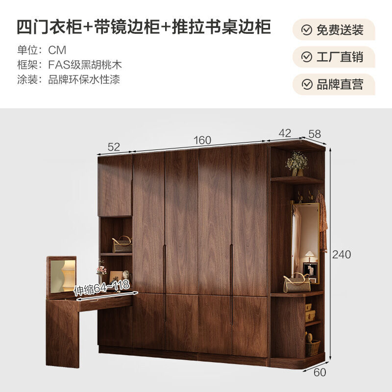 黑胡桃木實木衣櫃轉角化妝桌組合小戶型臥室家用書桌櫃一體學習桌