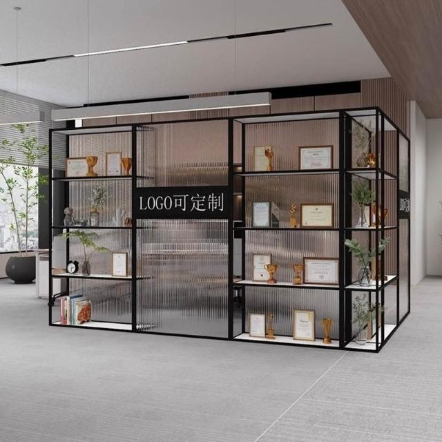 現代鐵藝玻璃隔斷形象墻辦公室入戶玄關屏風裝飾簡約背景墻置物架