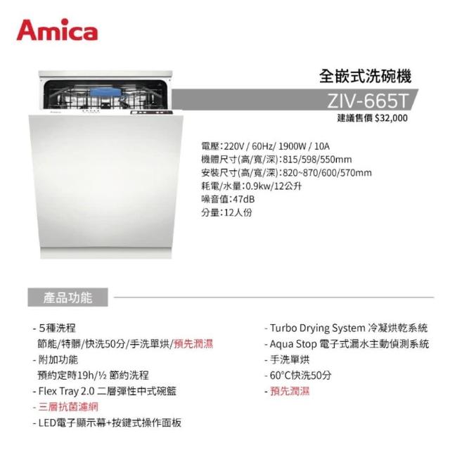 AmicaZIV-665T 全嵌式洗碗機 60cm 12人份 220V 崁入式 洗+烘 烘碗機