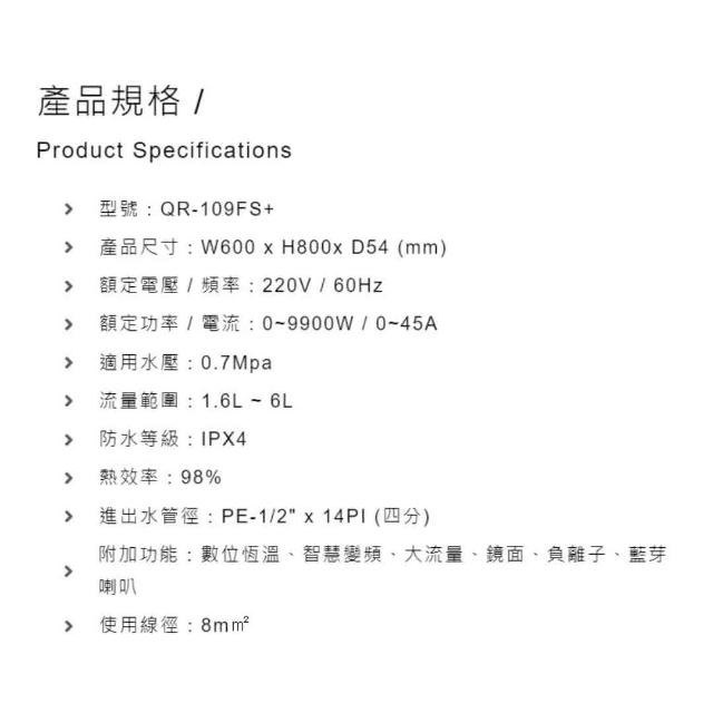 ReWatt 綠瓦QR-109FS+ 數位恆溫變頻電熱水器 - 浴鏡款