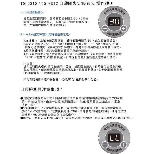 莊頭北TG-7312 一級雙控安全定時嵌入爐 (含基本安裝)|崁入爐|左爐定時|雙環銅爐頭|一級能效|瓦斯爐|