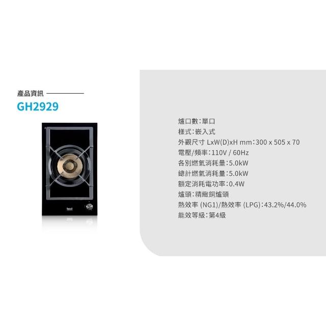 BEST 貝斯特GH2929 黑玻單口高效能瓦斯爐 (含基本安裝)|檯面爐|單口爐|直式|銅爐頭|側向出氣|安全熄火|