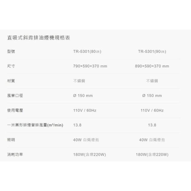 莊頭北TR-5301 直吸式斜背排油煙機 (含基本安裝)|斜背式|90公分|2段式風力|